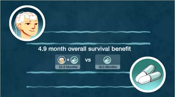 新診斷GBM患者的試驗結(jié)果也是類似,僅使用替莫唑胺治療的患者歷史對照中位OS為14.7個月,試驗中同時配合TTFields的患者,則超過了39個月!