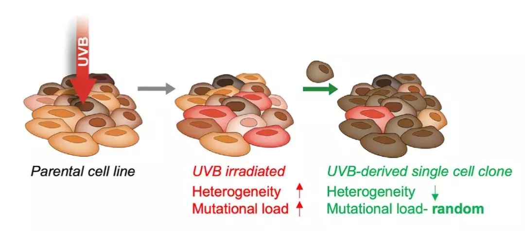 研究人員用適度的紫外線(UVB)照射一個(gè)黑色素瘤細(xì)胞系,照完之后做全外顯子測(cè)序。結(jié)果和預(yù)料的一樣,照射后的黑色素瘤細(xì)胞的TMB升高了,異質(zhì)性也升高了。不過,經(jīng)過紫外線照射的細(xì)胞在培養(yǎng)皿里的生長速度卻變慢了。