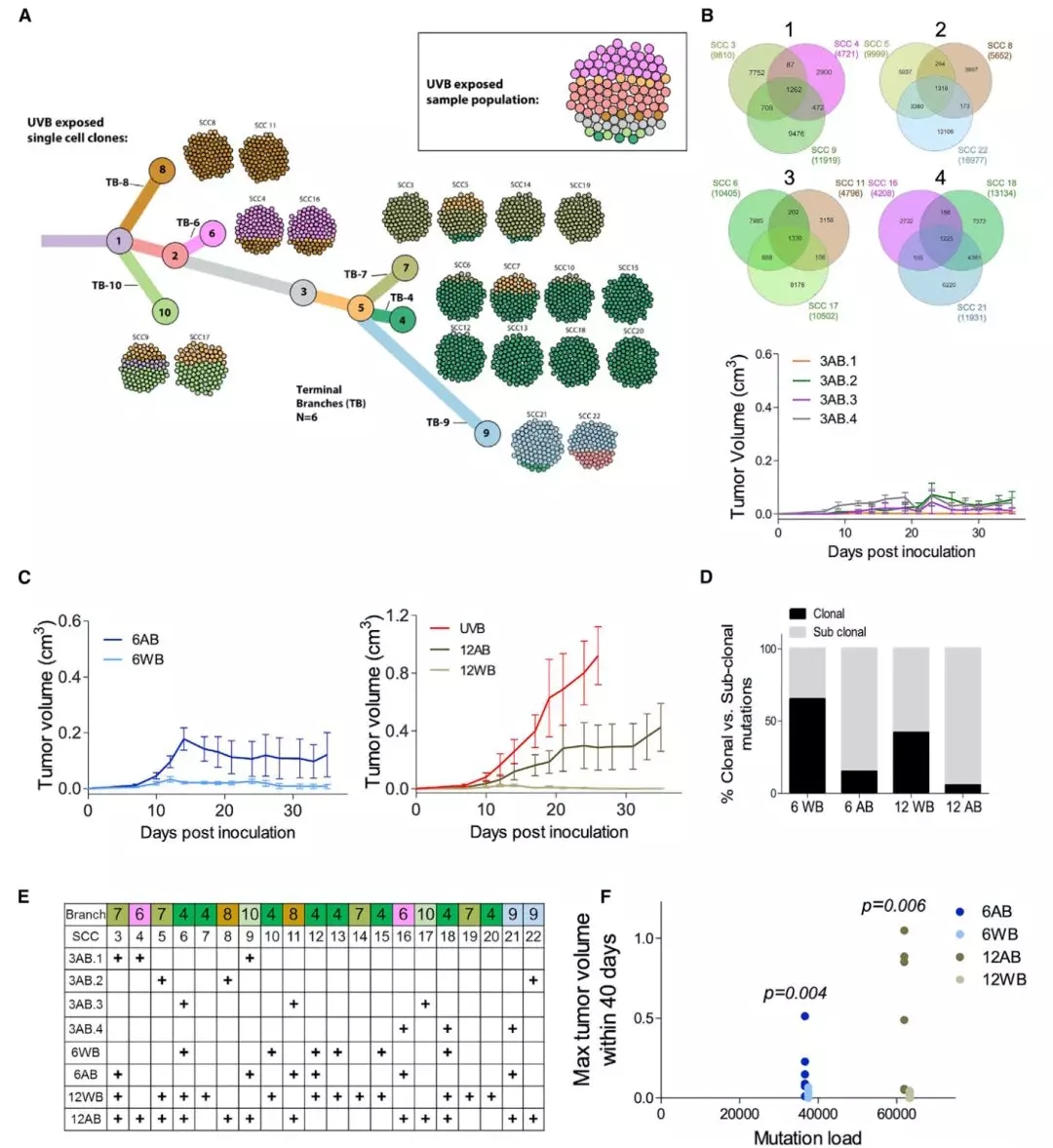 他們從經(jīng)過紫外線處理的黑色素瘤細(xì)胞中,單獨(dú)分離出來了兩個(gè)單細(xì)胞克隆(SCC)。單細(xì)胞測(cè)序結(jié)果發(fā)現(xiàn),這兩個(gè)單細(xì)胞克隆的異質(zhì)性非常低,細(xì)胞的突變量差異也非常大,從3600到16977個(gè)體細(xì)胞突變的細(xì)胞都有。