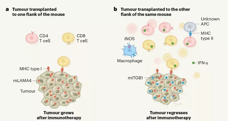 使用PD-1抑制劑+CTLA-4單抗聯(lián)合治療時(shí),腫瘤更是完全消失了。如果把mITGB1和mLAMA4,換成兩種只能被效應(yīng)T細(xì)胞識(shí)別的MHCI類(lèi)新抗原,免疫治療的療效就基本消失了。這說(shuō)明激活免疫重要的是抗原類(lèi)型,而不是抗原量。