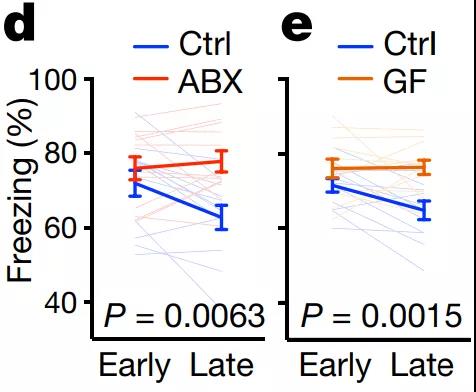 在恐懼記憶的消退過程中,普通小鼠(藍)和抗生素治療小鼠(d紅)、無菌小鼠(e紅)發(fā)生僵直的比例變化