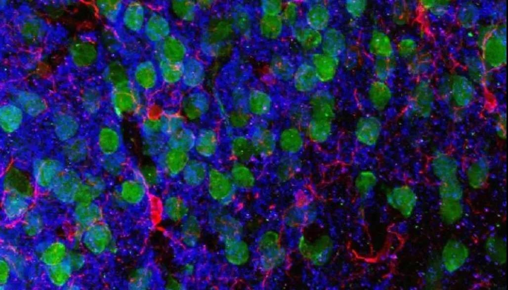前額葉皮層內側,皮質神經元(綠),小膠質細胞(紅),圖片來自于研究人員ChristopherParkhurst and David Artis