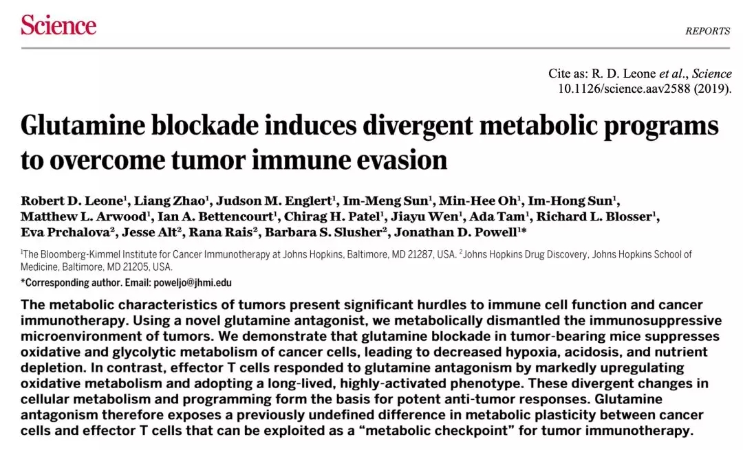 [1].Robert D. Leone, Liang Zhao, Judson M.Englert, et al. Glutamine blockade induces divergent metabolic programs toovercome tumor immune evasion[J]. Science, 2019.