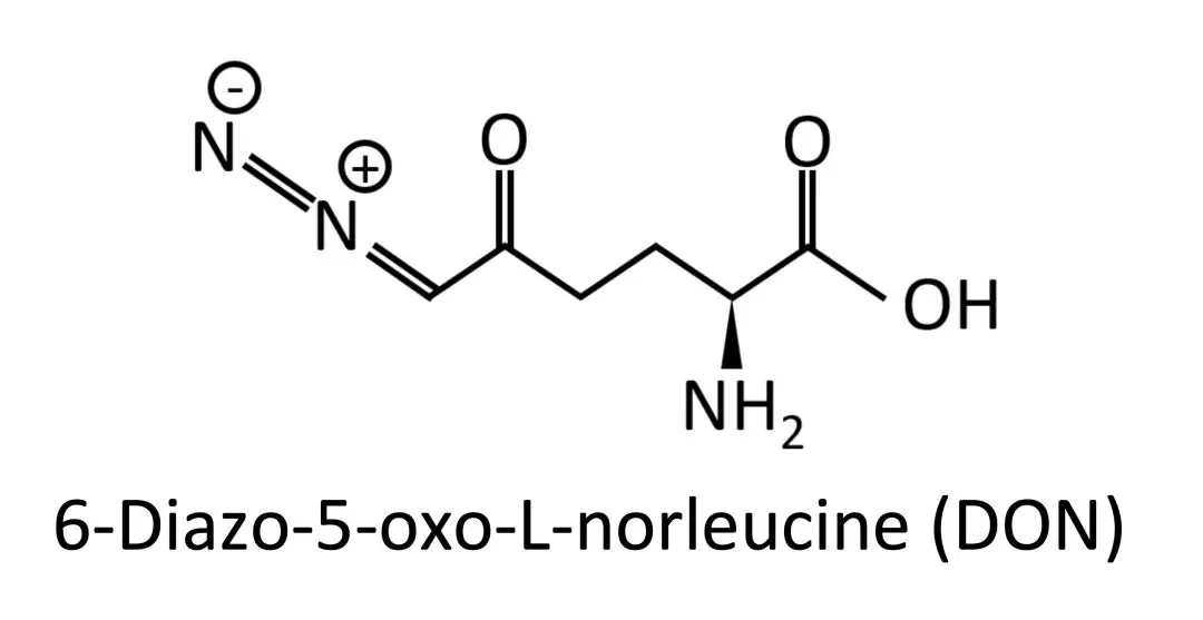 唯一的辦法就是全面阻斷谷氨酰胺代謝,也就是同時(shí)抑制多種與谷氨酰胺代謝有關(guān)的酶,DON(6-Diazo-5-oxo-L-norleucine)就是這樣一個(gè)化合物[9]。