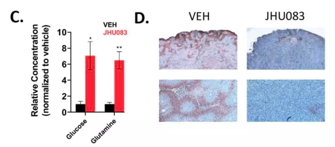 隨之而來的是,腫瘤內(nèi)的谷氨酰胺和葡萄糖含量顯著上升,腫瘤的缺氧狀態(tài)也顯著改善了。JHU083不僅切斷了腫瘤的能量,還改造了腫瘤微環(huán)境,把“不毛”之地,變成了“富庶”之地。