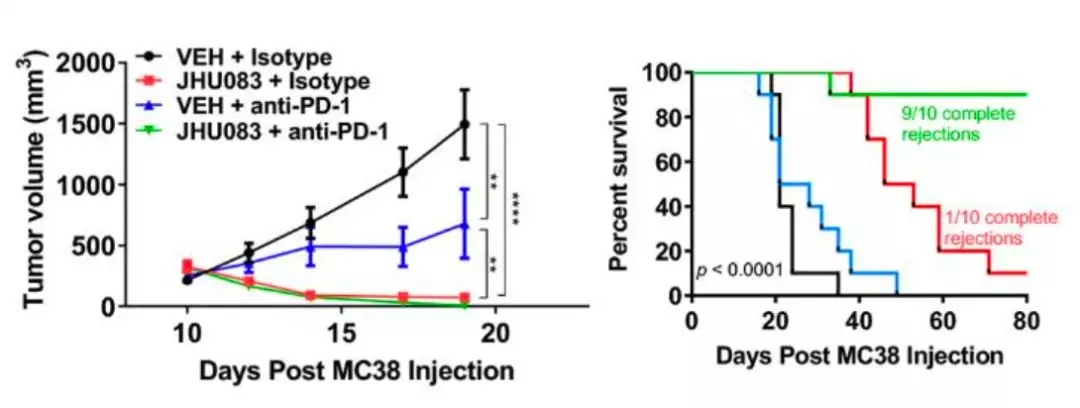 無論如何也沒想到,JHU083和PD-1抑制劑同時(shí)給藥效果最好。原本對PD-1抑制劑完全沒反應(yīng)的MC38,在JHU083和PD-1抑制劑同時(shí)使用時(shí),接種MC38的小鼠完全緩解率接近100%。
