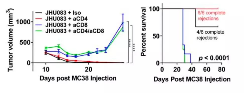 Powell團(tuán)隊(duì)在結(jié)腸癌MC38、淋巴瘤EL-4、結(jié)腸癌CT26和黑色素瘤B16這四個(gè)癌細(xì)胞系中,做了深入研究。在小鼠身上分別接種4種癌細(xì)胞之后,注射JHU083抗癌效果良好,所有類型的小鼠存活率都顯著提高。而且抗癌效果還非常持久(請默默記住)。