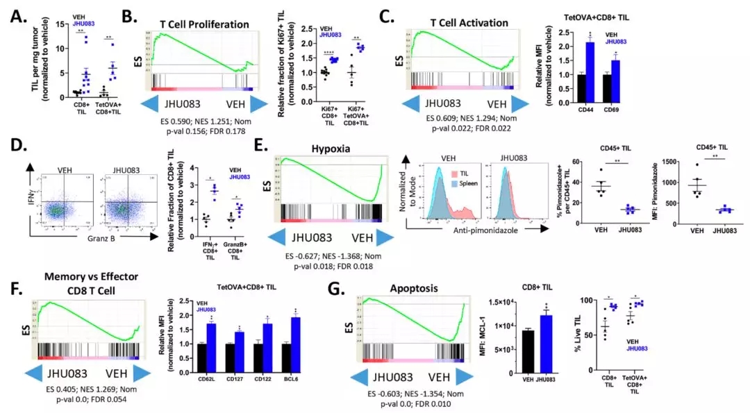 首先,Powell團(tuán)隊(duì)證實(shí),JHU083治療之后,腫瘤中CD8+ T細(xì)胞浸潤增加,這應(yīng)該是腫瘤微環(huán)境改善后的結(jié)果。而且,這些腫瘤浸潤T細(xì)胞中,有抗原特異性的占比較多。