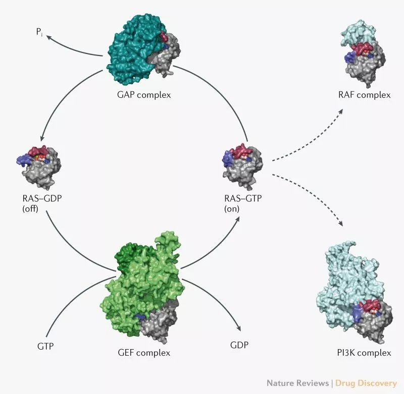 KRAS與GTP結(jié)合時(shí)處于“開啟”狀態(tài),與GDP結(jié)合時(shí)處于“關(guān)閉”狀態(tài),其構(gòu)象在不同狀態(tài)時(shí)有所不同,這種不同調(diào)節(jié)了其結(jié)合“伙伴”的能力,如SOS1、PI3K、RAF以及GAPs.(圖片來源:Nature Reviews Drug Discovery)