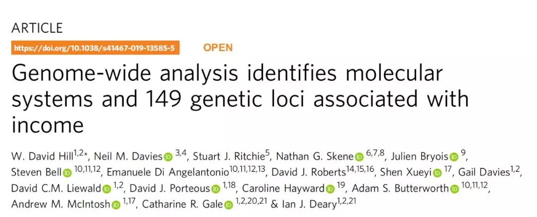 2019年12月16日,愛丁堡大學(xué)的W. David Hill團(tuán)隊(duì)在國際頂尖學(xué)術(shù)期刊 Nature 雜志子刊 Nature Communications 雜志上發(fā)表了題為:Genome-wideanalysis identifies molecular systems and 149 genetic loci associated withincome(全基因組分析確定了與收入相關(guān)的分子系統(tǒng)和149個(gè)遺傳位點(diǎn))的研究論文。