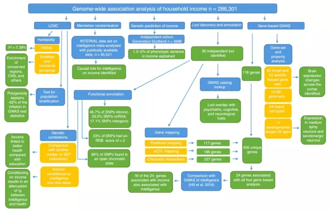 通過與eQTL和染色質(zhì)互作分析,研究人員將上述基因位點(diǎn)縮小至24個(gè)基因,其中18個(gè)是與智力相關(guān)的基因,表明智力是導(dǎo)致收入差異的重要原因。