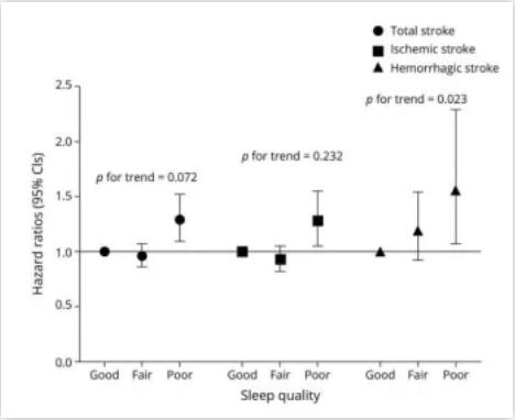 研究者表示,這與缺血性中風(fēng)的研究結(jié)果相似,相比良好睡眠質(zhì)量的參與者而言,睡眠質(zhì)量較差的參與者總中風(fēng)風(fēng)險(xiǎn)、缺血性和出血性中風(fēng)風(fēng)險(xiǎn)分別會增加29%、28%和56%;此外,研究者還觀察到,每晚睡眠≥9小時(shí)和午睡>90分鐘(風(fēng)險(xiǎn)比 1.85;95% CI 1.28-2.66)、每晚睡眠≥9小時(shí)和較差的睡眠質(zhì)量(風(fēng)險(xiǎn)比 1.82;95% CI 1.33-2.48)對總的中風(fēng)風(fēng)險(xiǎn)或會產(chǎn)生明顯的聯(lián)合效應(yīng);相比每晚持續(xù)睡眠7~9小時(shí)的參與者而言,持續(xù)睡眠至少9小時(shí)或?qū)?/span>7-9小時(shí)睡眠模式切換到至少9小時(shí)睡眠或會增加機(jī)體總的中風(fēng)風(fēng)險(xiǎn)。