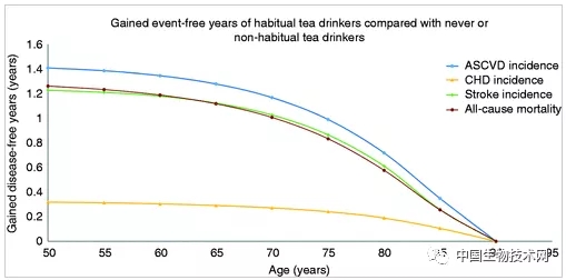 分析顯示,習(xí)慣性飲茶與更健康的壽命和更長(zhǎng)的預(yù)期壽命有關(guān)。例如,50歲的習(xí)慣性飲茶的人與從未飲茶或非習(xí)慣性飲茶的人相比,動(dòng)脈粥樣硬化性心血管疾病和中風(fēng)的可能性會(huì)延遲1.41年,預(yù)期壽命要長(zhǎng)1.26年。