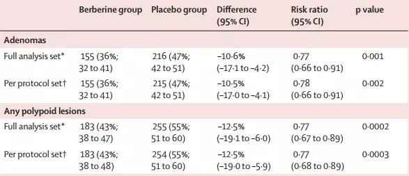 黃連素組和安慰劑組,分別有429和462名患者完成了兩年的試驗隨訪,這些患者結(jié)直腸腺瘤的復(fù)發(fā)情況對比,就是試驗的主要終點。