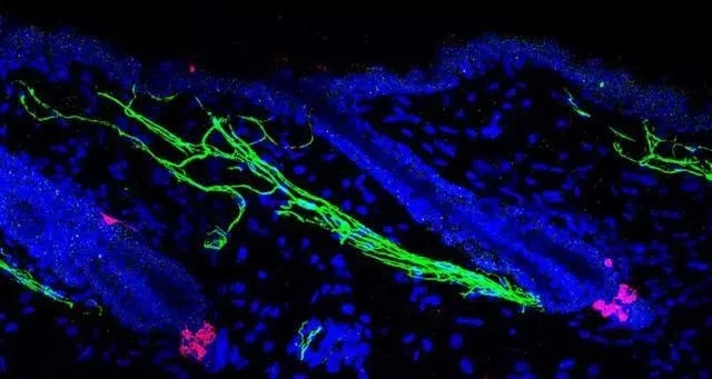 黑素干細(xì)胞(紅)和交感神經(jīng)(綠)