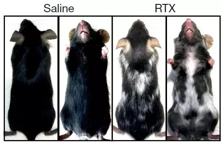 注射鹽水(saline)和樹脂毒素(RTX)小鼠毛發(fā)的對比(真·辣到褪色)