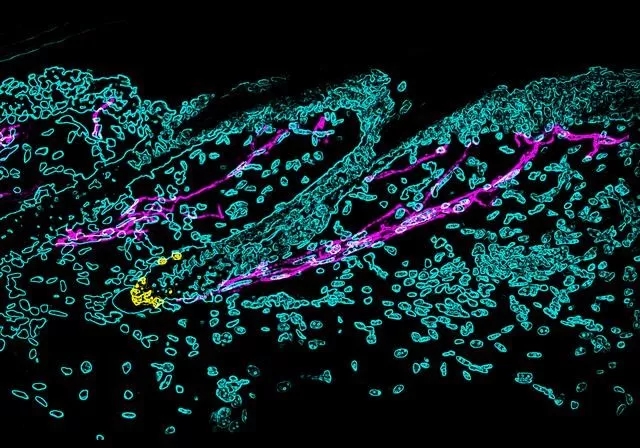 另一種染色方法下的黑素干細(xì)胞(黃)和交感神經(jīng)(紫)