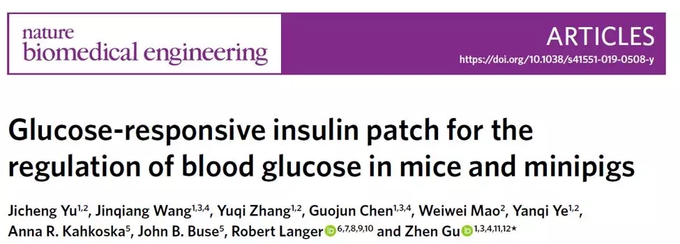 2020年2月3日,加州大學洛杉磯分校(UCLA)顧臻教授課題組及生物醫(yī)藥公司-Zenomics在 Nature Biomedical Engineering 雜志上發(fā)表了文章題為:Glucose-responsive insulin patch for the regulationof blood glucosein mice and minipigs 的研究論文。