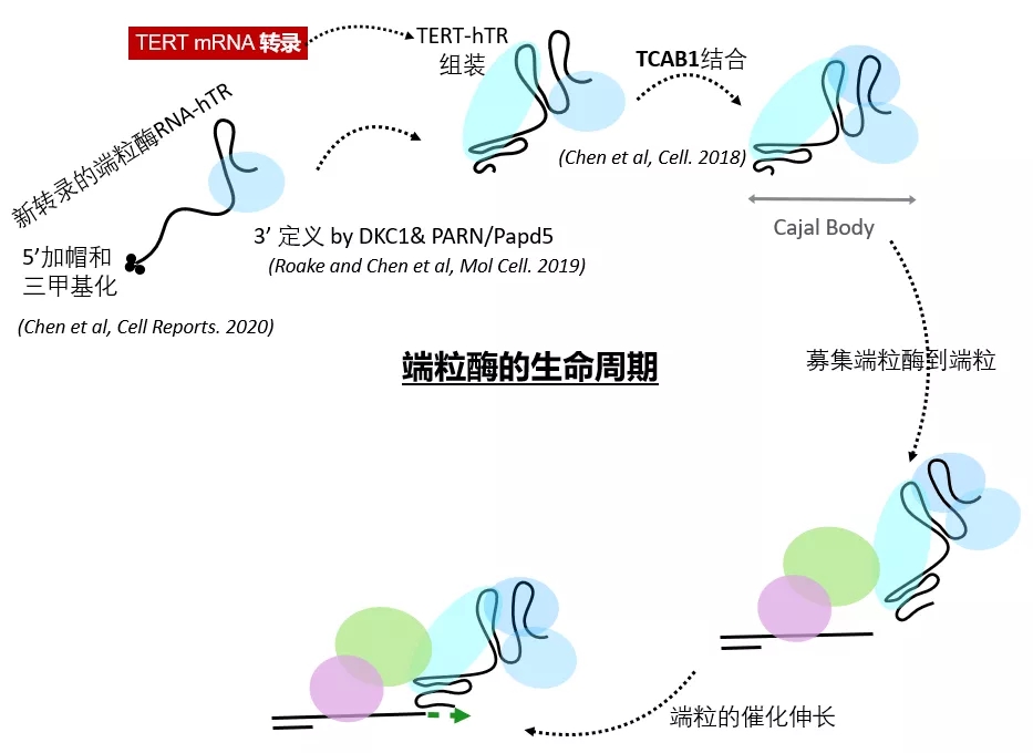端粒酶(telomerase)是人體,乃至單細(xì)胞酵母中,可以直接延長端粒的唯一分子機(jī)器。這個(gè)蛋白RNA復(fù)合體以非編碼RNA亞基hTR為模板,由逆轉(zhuǎn)錄酶TERT去催化端粒的延長。端粒酶的活性對TERT和hTR的分子豐度非常的敏感:單拷貝TERT或hTR的失活突變會(huì)造成50%的端粒酶的下降,但也足以引發(fā)先天性的短端粒早衰病;表達(dá)外源的TERT和/或hTR在體外細(xì)胞系里足以引發(fā)端粒的延長,也證明了提高hTR的分子水平對延長端粒的可行性。hTR的調(diào)控主要發(fā)生于轉(zhuǎn)錄后的一系列的RNA biogenesis步驟,包括hTR轉(zhuǎn)錄后的修飾(PTM)和成熟,細(xì)胞內(nèi)的定位,以及和TERT的有效組裝,直至形成能夠延長端粒的全酶(見下圖)。