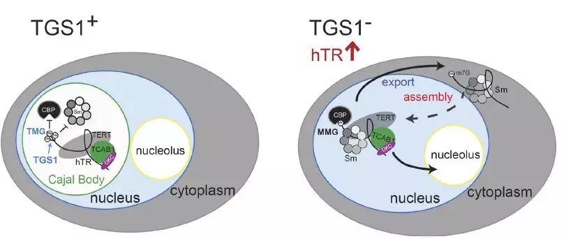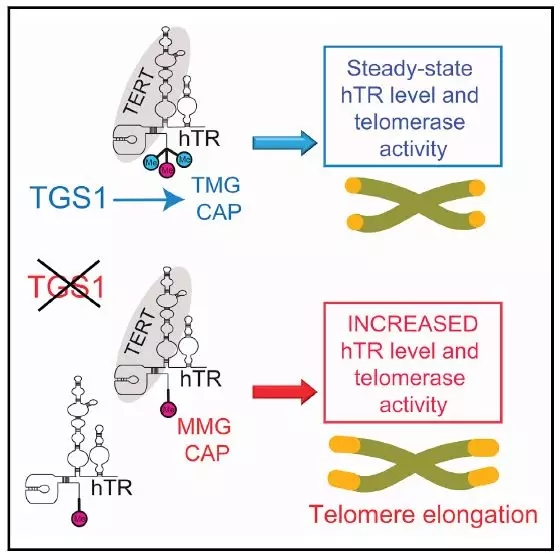 該研究第一次提供證據(jù)表明在人細(xì)胞里RNA三甲基化鳥苷合成酶(TGS1) 直接修飾了端粒酶RNA (hTR) 的三甲基化帽,TGS1的缺失會(huì)導(dǎo)致hTR的分子豐度和端粒酶活性的等比例增加,以至于人細(xì)胞內(nèi)的端粒的伸長。