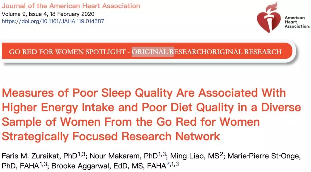 2020年2月17日,美國(guó)心臟協(xié)會(huì)雜志(Journal of the American HeartAssociation)在線發(fā)表了哥倫比亞大學(xué)歐文醫(yī)學(xué)中心的題為:Measures of Poor SleepQuality Are Associated With Higher Energy Intake and Poor Diet Quality in aDiverse Sample of Women From the Go Red for Women Strategically Focused ResearchNetwork 的研究論文。