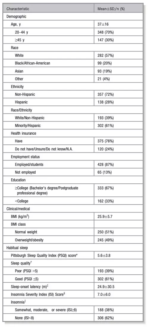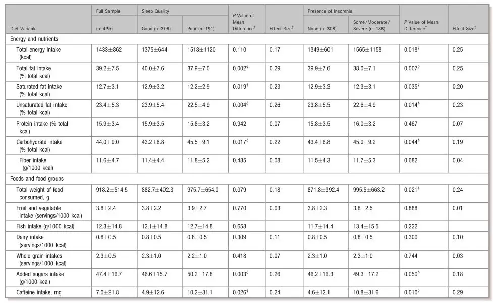 如下圖所示,研究人員記錄了495名女性的睡眠和飲食習(xí)慣,她們的種族不同,年齡在20至76歲之間。本研究的重點(diǎn)在于這些女性的睡眠質(zhì)量、入睡時(shí)間和失眠情況,因此,這些女性需要報(bào)告了其一年四季通常所吃食物的類(lèi)型和數(shù)量,據(jù)此,研究人員能夠更好的衡量她們的飲食習(xí)慣。