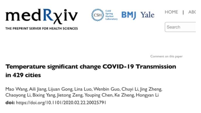 Mao Wang, et al. Temperature significantchange COVID-19 Transmission in 429 cities. MedRxiv. 25 Feb, 2020.
