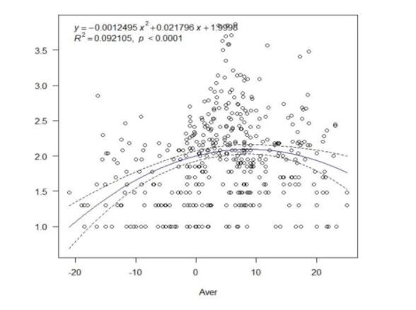 研究者發(fā)現(xiàn)日確診人數(shù)的對數(shù)值(lgN)隨溫度的升高,先上升后下降;峰值lgN對應(yīng)的平均溫度為8.72℃,最低溫度6.70℃,最高溫度12.42℃。在溫度較低的環(huán)境中,平均溫度每上升1℃,日確診人數(shù)增加0.83人;在單因素模型中,溫度較低的環(huán)境中,平均溫度每上升1℃,日確診減少降低0.86人。
