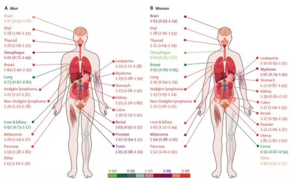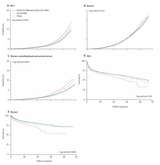 男性肺癌在這次的分析中影響不大,但宮頸癌、乳腺癌占到了女性癌癥發(fā)病的一半以上,研究團隊決定先剔除這兩種癌癥,分析女性其他癌癥風(fēng)險與BMI的關(guān)系,因此就有了女性肥胖與癌癥發(fā)病風(fēng)險上升27%有關(guān)的結(jié)論。