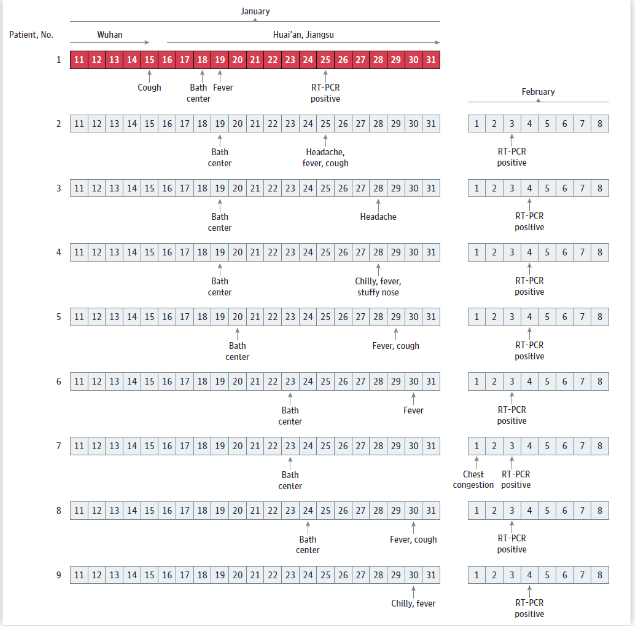 第一位患者,也就是患者1,曾去過武漢。他于1月15日出現(xiàn)咳嗽癥狀,1月18日去了該洗浴中心洗澡,1月19日開始發(fā)燒,并于2020年1月25日被確診感染新冠肺炎。