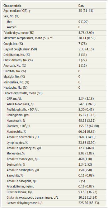 9位患者的中位年齡為35歲(24-50歲)。共有8位患者(89%)報告發(fā)燒,7例患者(78%)報告了咳嗽。