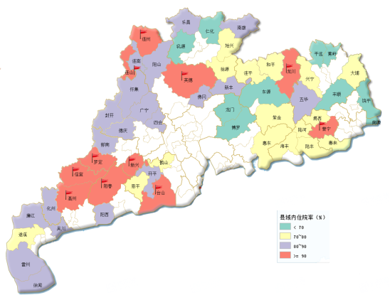 其中:高州市、連州市、陽春市、羅定市、英德市、信宜市、連山縣、臺(tái)山市、新興縣、龍川縣、普寧市11個(gè)縣(市)超過90%;縣域內(nèi)住院率85%-90%的縣(市)5個(gè);80%-85%的縣(市)15個(gè);小于70%的10個(gè)縣(市)。