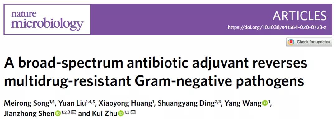2020年5月18日,中國農(nóng)業(yè)大學朱奎教授和沈建忠院士在 Nature Microbiology 雜志在線發(fā)表題為:A broad-spectrum antibiotic adjuvant reverses multidrug resistant Gram-negative pathogens 的研究論文。