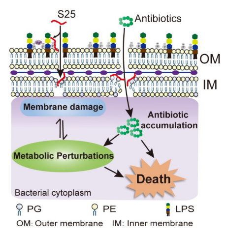 在該研究中,首次報道了一種新型線性短鏈廣譜抗菌增效劑SLAP-S25,可以提高多種臨床常用抗菌藥物如四環(huán)素、萬古霉素、氧氟沙星、利福平和多粘菌素對多重耐藥大腸桿菌以及其它耐藥的革蘭氏陰性菌的抗菌效果。