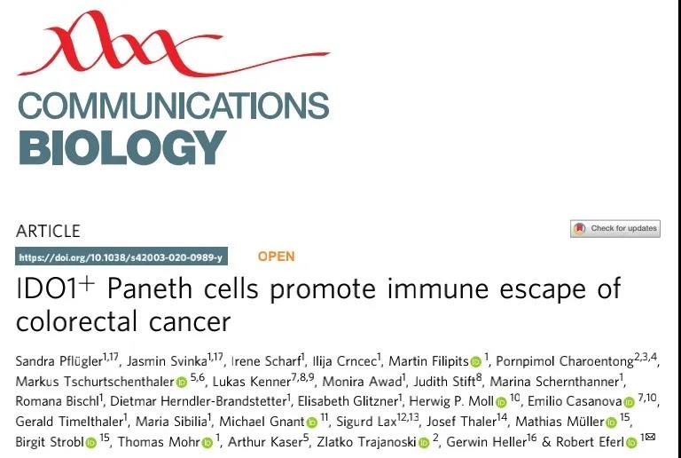 這項(xiàng)研究由奧地利維也納醫(yī)科大學(xué)(MedUni-Vienna)癌癥研究所的羅伯特·埃弗爾(Robert Eferl)領(lǐng)導(dǎo)并發(fā)表在《通訊生物學(xué)》上。題目為“IDO1+ Paneth cells promote immune escape of colorectal cancer”。