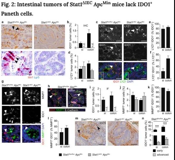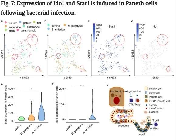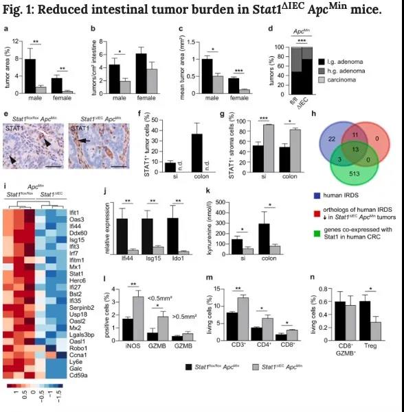 進(jìn)一步的研究表明,具有完整Stat1基因的ApcMin腫瘤含有表達(dá)Ido1的特殊細(xì)胞。在人類腸息肉中也發(fā)現(xiàn)了類似的細(xì)胞。而這些細(xì)胞不存在于Stat1缺陷的ApcMin腫瘤中。這也進(jìn)一步驗(yàn)證了,敲除轉(zhuǎn)錄因子Stat1的細(xì)胞,對(duì)人體免疫系統(tǒng)抵抗腫瘤有益。